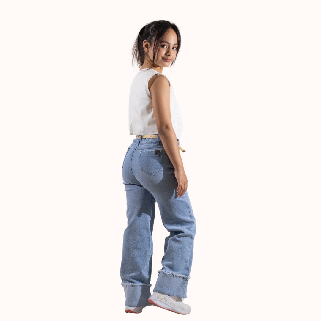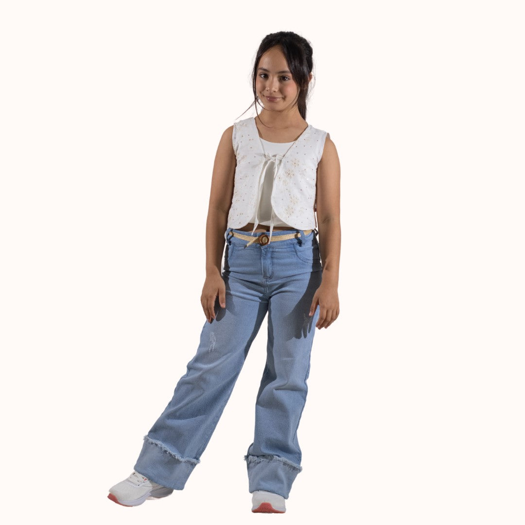 Conjunto de jean bota campana, chaleco bordado y blusa para niña